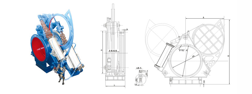 气动扇形盲板阀主要由左阀体、右阀体、丝杠副、阀板、密封圈、杠杆、气缸等零件组成,并由底座、支撑柱构成一个刚性结构体。阀门中设有夹紧、松开气缸和翻板气缸,夹紧、松开气缸通过杠杆副和丝杆螺旋副驱动左、右阀体完成松开、夹紧动作,翻板气缸驱动阀板完成开关动作。橡胶密封圈镶嵌在阀板上,具有耐温高、密封性能好、更换方便、使用寿命长等特点。
