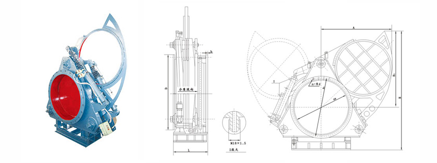 液动扇形盲板阀主要由左阀体、右阀体、丝杆副、翻板、密封圈、杠杆、液压油缸等零件组成,并由底座、支撑柱构成一个刚性结构体。阀门中设有夹紧油缸和翻板油缸,夹紧油缸通过杠杆副和丝杠螺旋副驱动左、右阀体完成松开、夹紧动作,翻板油缸驱动翻板完成开关动作。橡胶密封圈镶嵌在翻板上,具有耐高溫、密封性能好、更换方便、使用寿命长等特点。