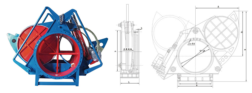 电动扇形盲板阀主要由左阀体、右阀体、丝杆副、翻板、密封圈、杠杆、电动推杆等零件组成,并由底座、支撑柱构成一个刚性结构体。阀门中设有夹紧推杆和翻板推杆,夹紧推杆通过杠杆副和丝杠螺旋副驱动左、右阀体完成松开、夹紧动作,翻板推杆驱动翻板完成开关动作。橡胶密封圈镶嵌在翻板上,具有耐高温、密封性能好、更换方便、使用寿命长等特点。