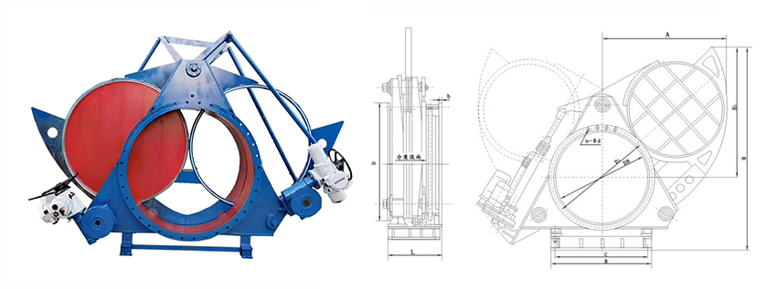 电动扇形盲板阀主要由左阀体、右阀体、丝杆副、翻板、密封圈、杠杆、电动推杆等零件组成,并由底座、支撑柱构成一个刚性结构体。阀门中设有夹紧推杆和翻板推杆,夹紧推杆通过杠杆副和丝杠螺旋副驱动左、右阀体完成松开、夹紧动作,翻板推杆驱动翻板完成开关动作。橡胶密封圈镶嵌在翻板上,具有耐高温、密封性能好、更换方便、使用寿命长等特点。