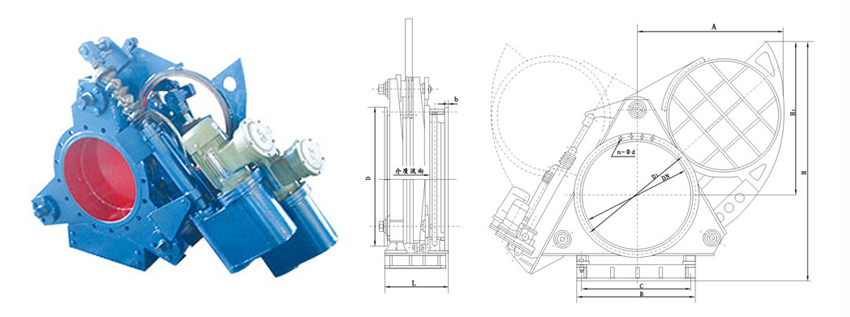 电动扇形盲板阀主要由左阀体、右阀体、丝杆副、翻板、密封圈、杠杆、电动推杆等零件组成,并由底座、支撑柱构成一个刚性结构体。阀门中设有夹紧推杆和翻板推杆,夹紧推杆通过杠杆副和丝杠螺旋副驱动左、右阀体完成松开、夹紧动作,翻板推杆驱动翻板完成开关动作。橡胶密封圈镶嵌在翻板上,具有耐高温、密封性能好、更换方便、使用寿命长等特点。
