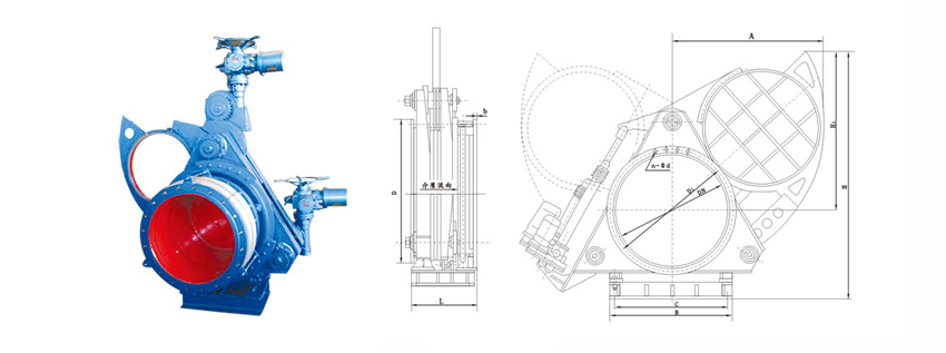 电动扇形盲板阀主要由左阀体、右阀体、丝杆副、翻板、密封圈、杠杆、电动推杆等零件组成,并由底座、支撑柱构成一个刚性结构体。阀门中设有夹紧推杆和翻板推杆,夹紧推杆通过杠杆副和丝杠螺旋副驱动左、右阀体完成松开、夹紧动作,翻板推杆驱动翻板完成开关动作。橡胶密封圈镶嵌在翻板上,具有耐高温、密封性能好、更换方便、使用寿命长等特点。